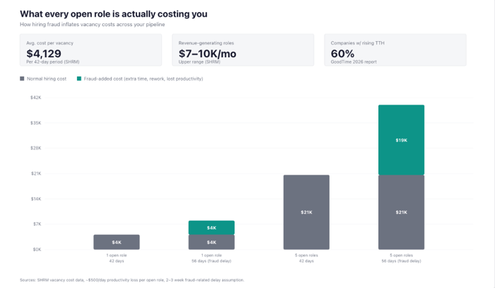 What makes this particularly hard to address is that the symptoms show up as separate, seemingly unrelated problems: slow hiring, missed deadlines, recruiter burnout, candidate drop-off. Each one gets its own explanation in its own silo. But the through-line connecting them is often the same: your top-of-funnel is compromised, your team is spending its energy on verification instead of evaluation, and the resulting drag is compounding across the business in ways that nobody is measuring. According to SHRM, each unfilled position costs companies an average of $4,129 over a 42-day vacancy period, and for revenue-generating roles that figure can climb to $7,000–$10,000 per month.