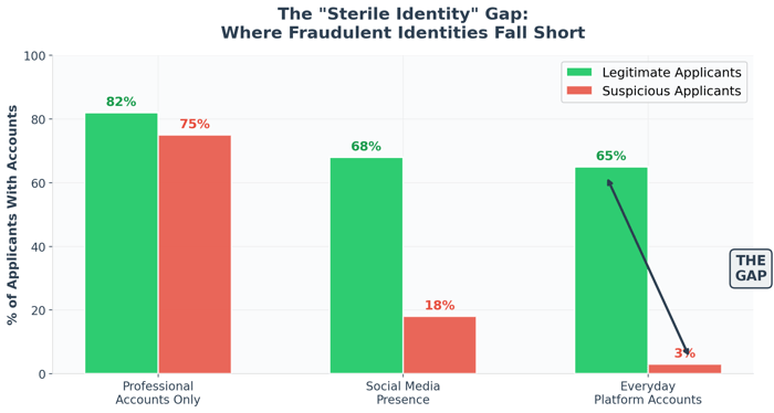 They're expensive to simulate at scale. A fraud operation running hundreds of fake identities can spin up LinkedIn profiles and email addresses efficiently. Building out convincing everyday platform footprints across dozens of services for each identity? That's a cost-benefit equation that doesn't pencil out.