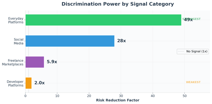 Our interpretation: while freelance platforms can be part of the fraud ecosystem, having a genuine, established presence on them still correlates with real economic activity and real identity. The signal isn't as strong as everyday platforms, but it adds value as part of a composite score.