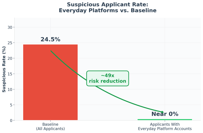 But the real story is on the other side of the ledger. When we looked at suspicious rates, certain everyday platform categories showed rates at or near zero. In plain terms: among applicants with accounts on specific everyday platforms, we found virtually no confirmed fraud. Not low fraud. Zero fraud.